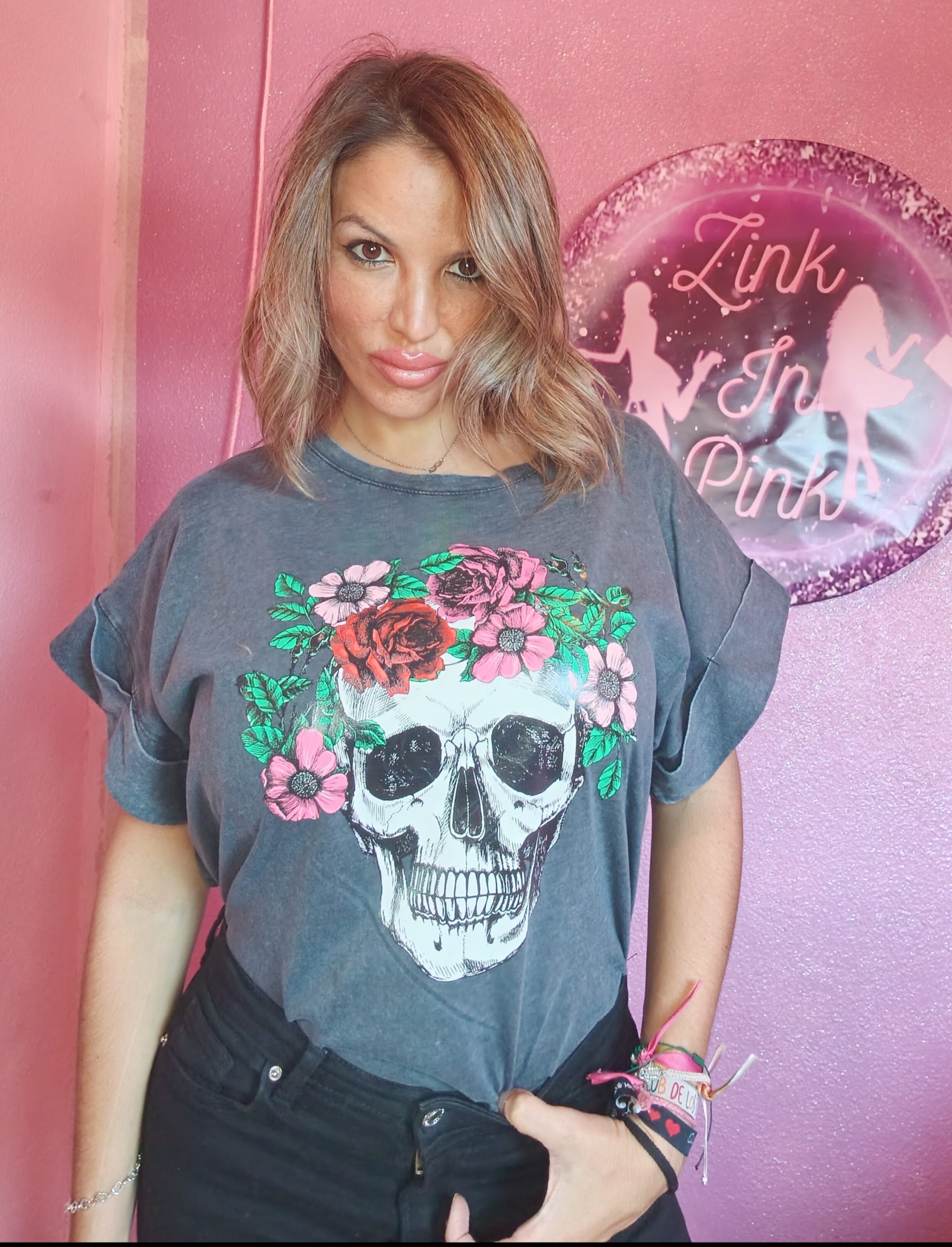 Camiseta gris oscura con una Katrina, mangas anchas y con dobladillo.
