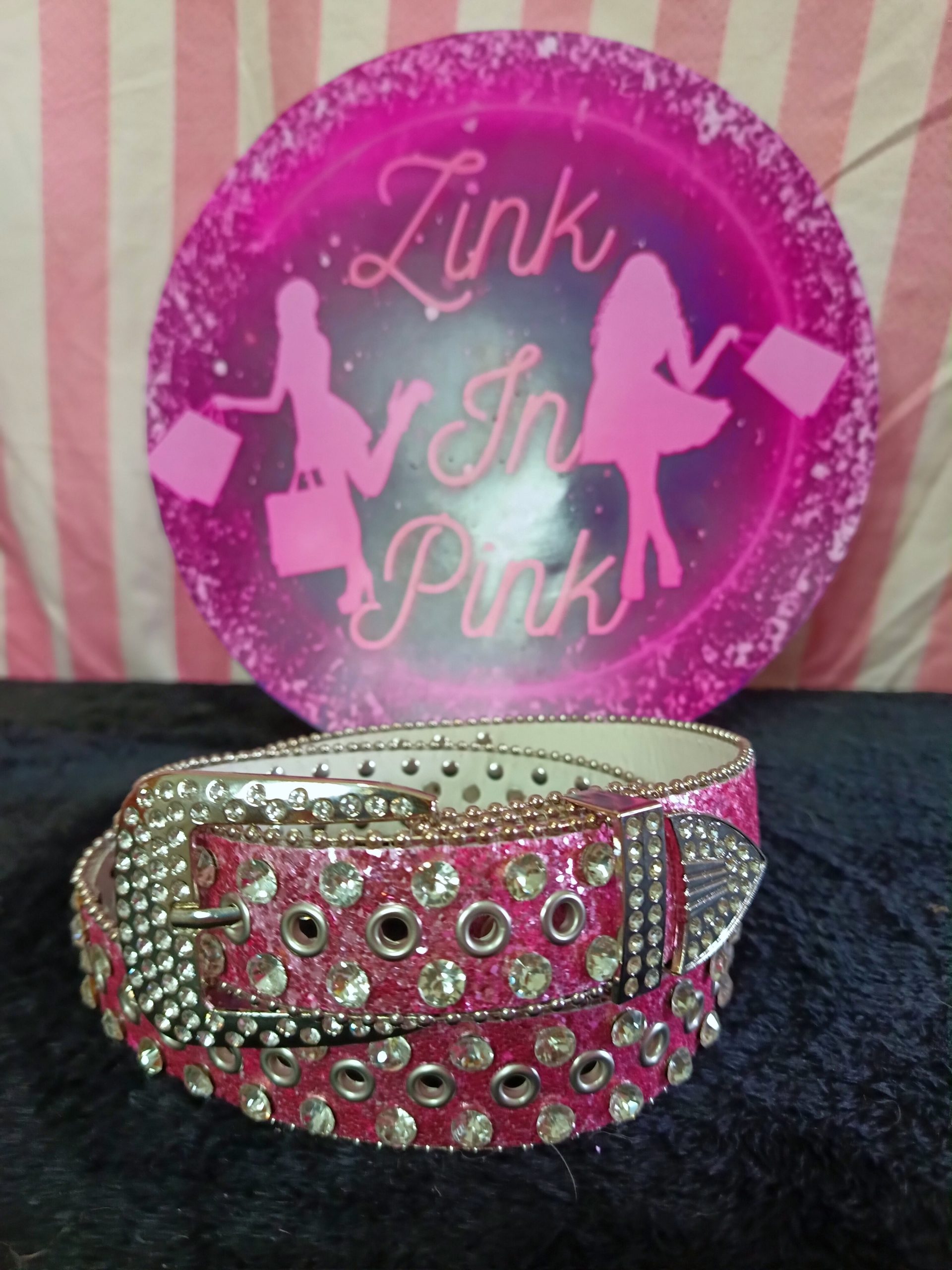 Cinturón con diamantes de imitación en blanco, purpurina en rosa y tachuelas para mujer, color metalizado brillante.